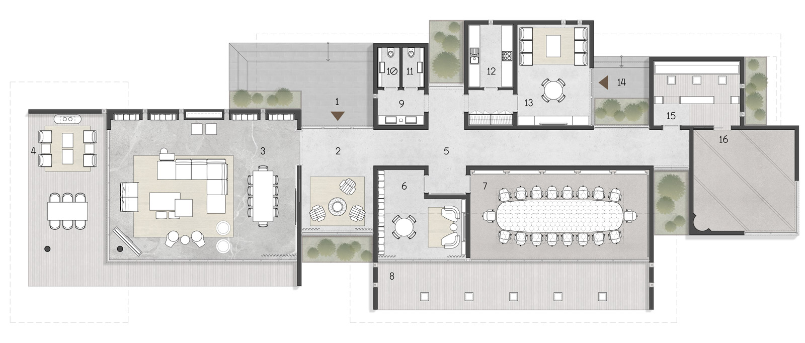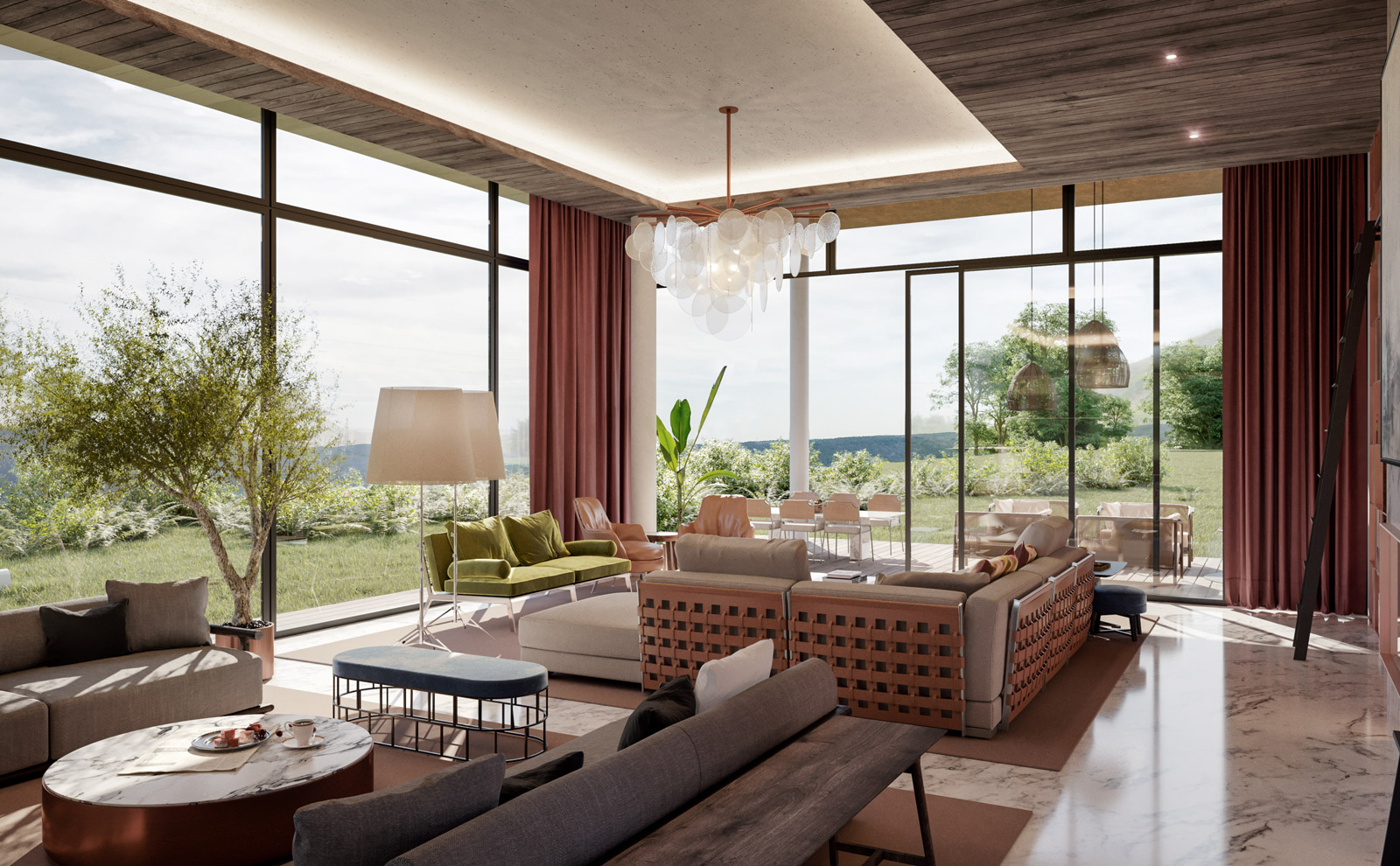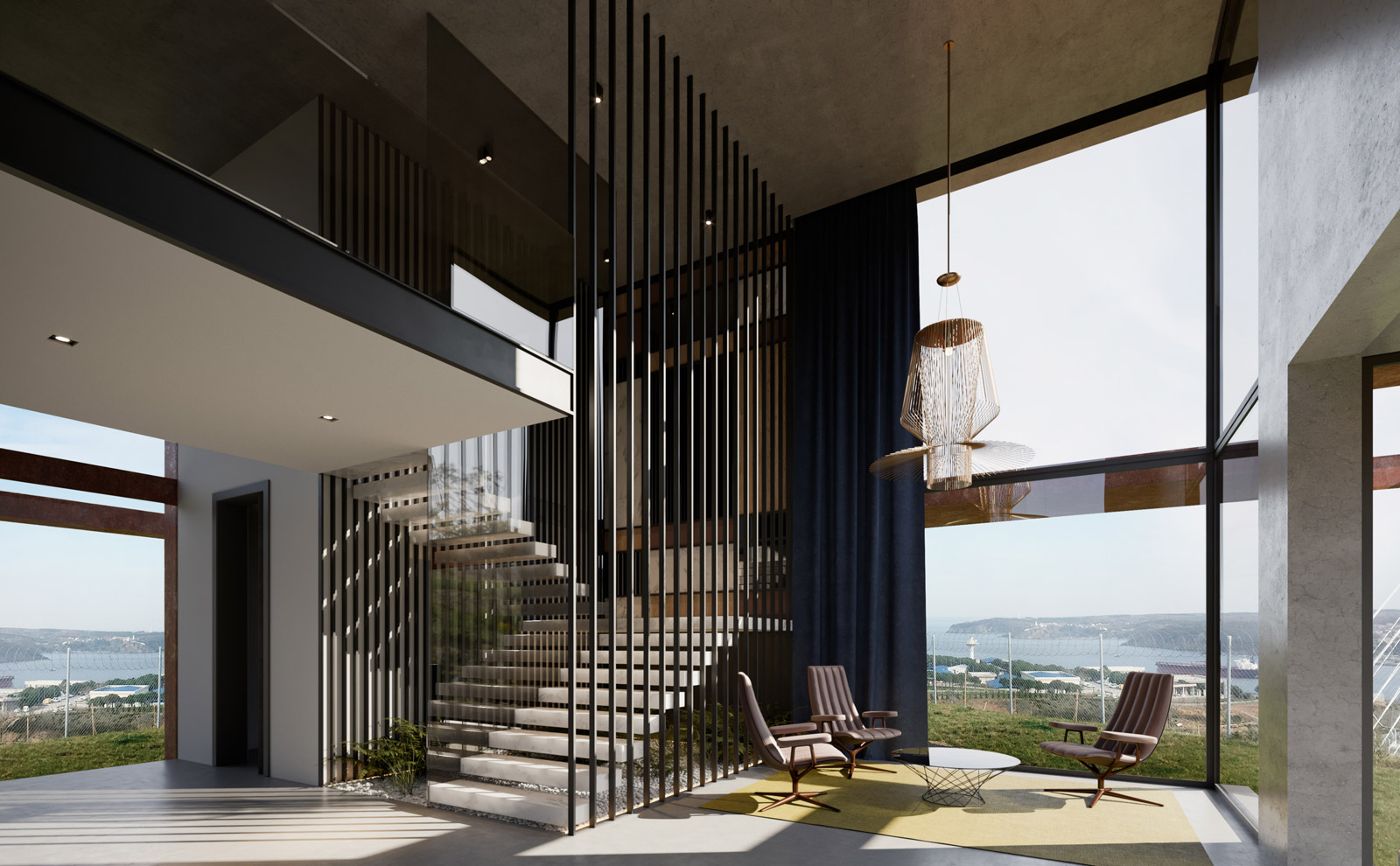 Geniş cam yüzeylerle eşsiz manzarayı içeriye davet eden yüksek hacimli ana girişteki mobilyalar Walten Knoll’den seçilirken, Foscarini aydınlatma ile sade ve şık bir iç mekân sağlanmış oldu.