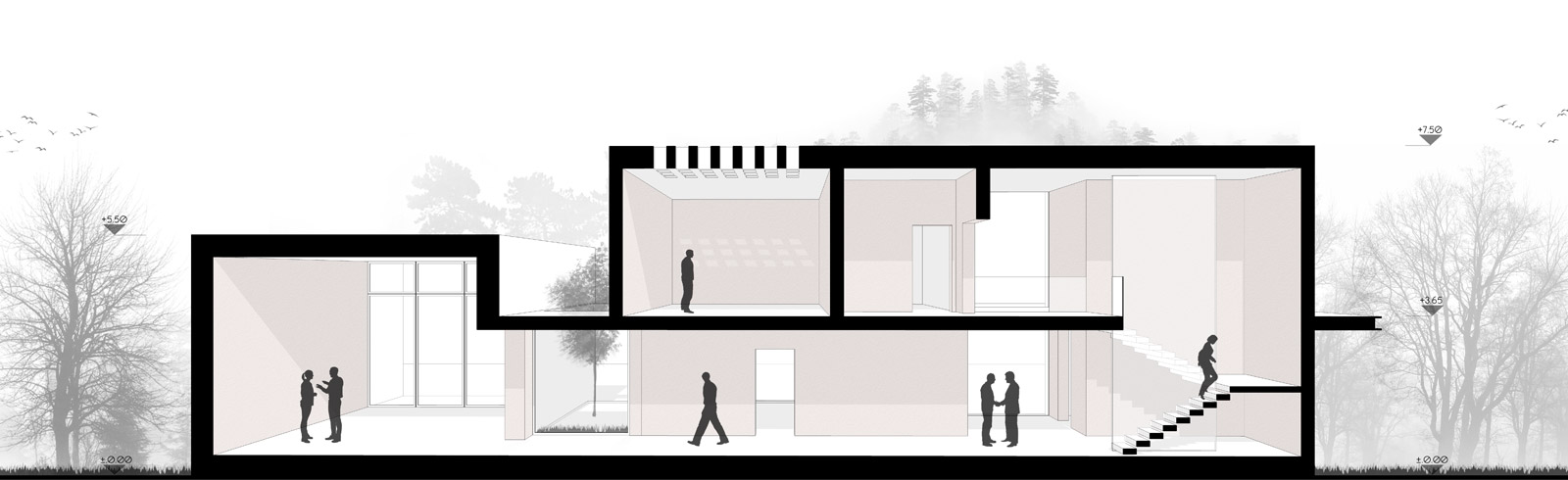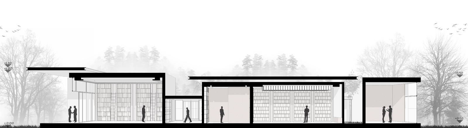 Fonksiyon çeşidine uygun olarak bölünme ve kopmalarla kütlesel hareketlilik sağlanırken, uzun corten saçaklar ve çatı elemanlarıyla mimari süreklilik ve bağlayıcılık yakalandı. Cephelerdeki geniş açıklıklar manzaraya ve fonksiyona göre şekillendi. Kütleler arasında planlanan küçük iç bahçeler ikincil derece önemdeki, mahremiyet gerektiren mekânlara gün ışığı taşırken, bahçe etkisi ve yeşilin iç mekâna sirayet etmesine de imkân tanıdı.