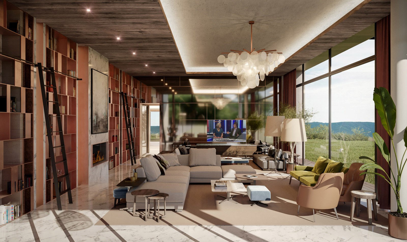 Lounge alanında bir cepheyi boydan boya kaplayan bakır kütüphane ve mermer şömine, uzun kenarda sade bir dolu yüzey oluşturarak algının ve dikkatin geniş cam yüzey ardındaki muhteşem boğaz manzarasına yönlenmesini sağladı. Olabildiğince ev konforunda olması amaçlanan lounge’un ithal mobilyalarında deri, keten, kadife gibi doğal kumaşlar kullanıldı.