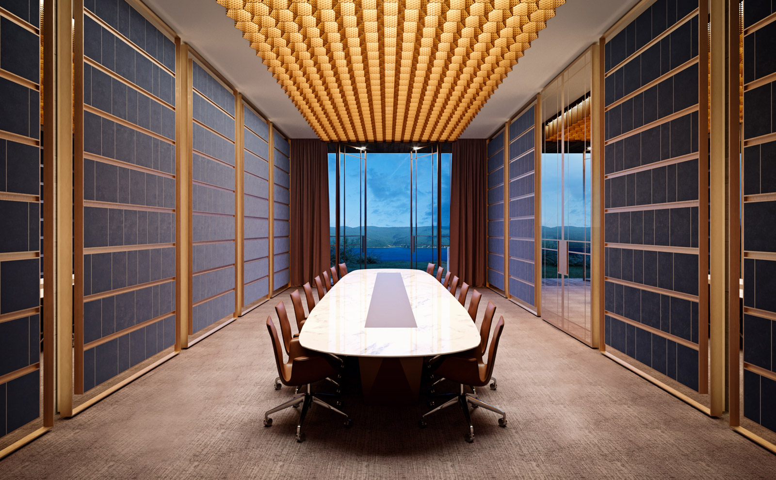 Toplantı odasının duvarları bakır ve akustik özellikli malzemeden oluşan özel üretim panellerle kaplanırken, tavanda uygulanan özel tasarım bakır aydınlatmayla mekâna farklı bir kimlik kazandırılmış oldu. Mermer masa ve deri sandalyeler Walter Knoll’den seçildi.