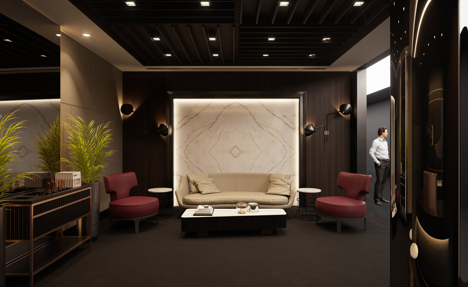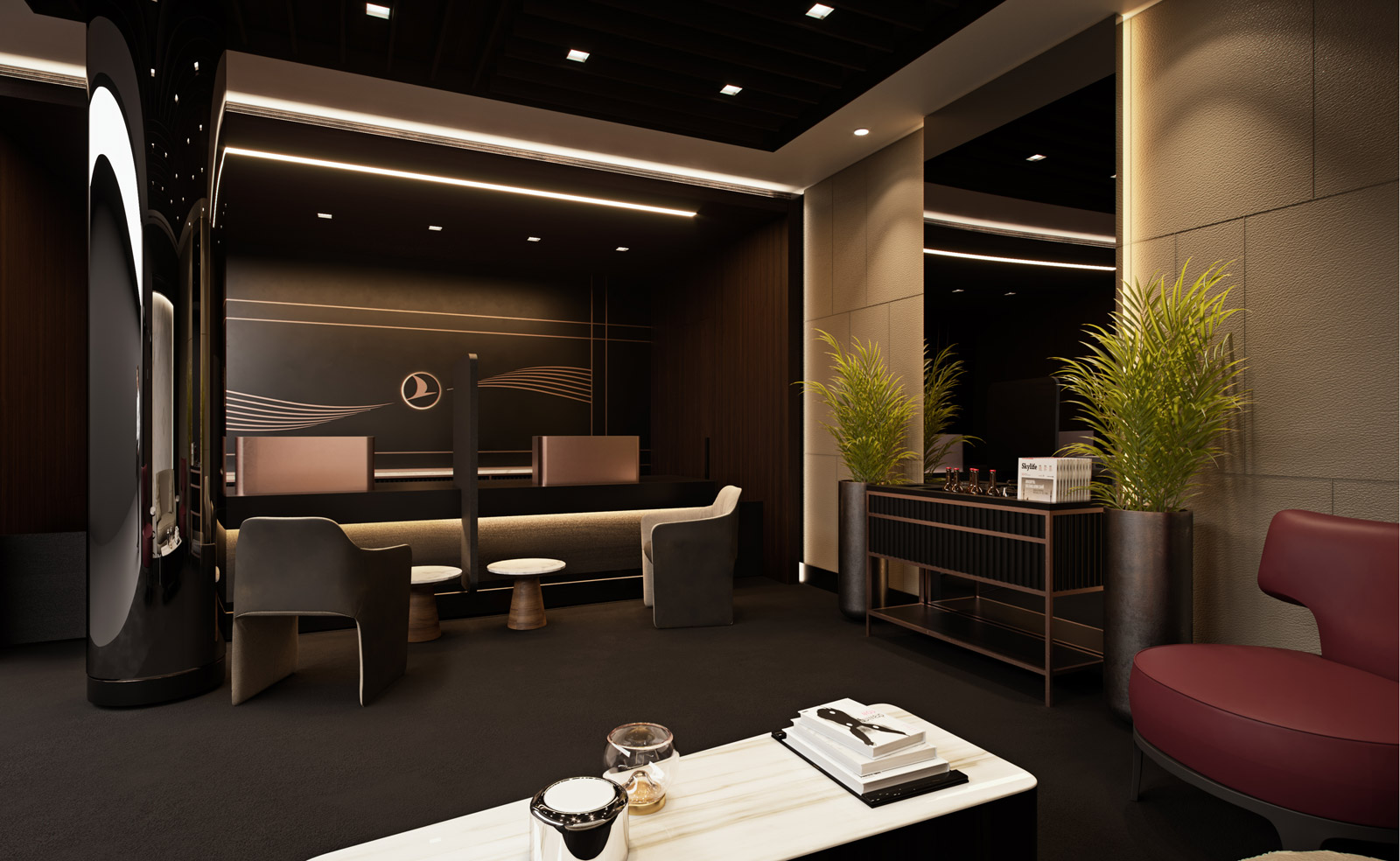 Türk Hava Yolları’nın Business Class kurumsal renkleri olan rose gold ve siyahın baskın olduğu mekânlarda kullanılan tütsülenmiş ceviz ahşap kaplamalar, deri duvar kaplamaları ve Calacatta mermer gibi doğal malzemeler, renk ve doku çeşitliliğinde bir harmoni yakalanmasını sağlarken, mekânın ihtiyaç duyduğu “prestij” algısına katkıda bulundu.