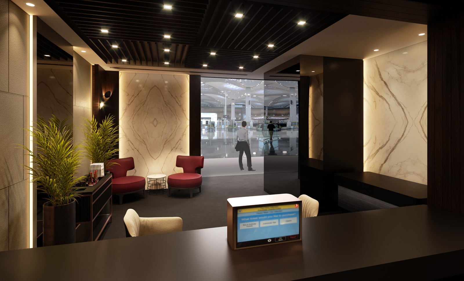 Türk Hava Yolları’nın Business Class yolcularına yaşattığı ayrıcalıklı deneyimin mimari yansıması olarak, bilet hizmetleri, bagaj hizmetleri, transfer bankosu gibi birçok mekân, standart bir “hizmet ofisi” tasarımının çok ötesinde, müşteri profiline uygun, göze hitap eden ve yolcunun lounge konforunu aramayacağı bir anlayışıyla yeniden tasarlandı.
