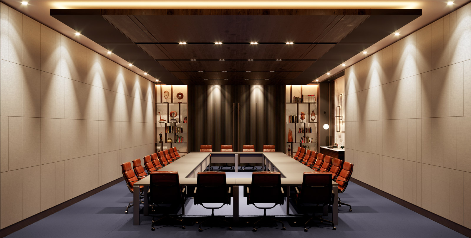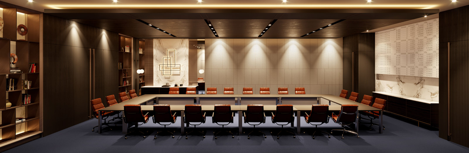 Yönetim kurulunun toplandığı büyük toplantı odasında “prestij” algısı yaratan, hakiki deri, mermer, bakır gibi gösterişli malzemeler tercih edilirken, Walter Knoll ve Lema’dan seçilen ithâl mobilyalar mekânın önemli tamamlayıcıları oldu.