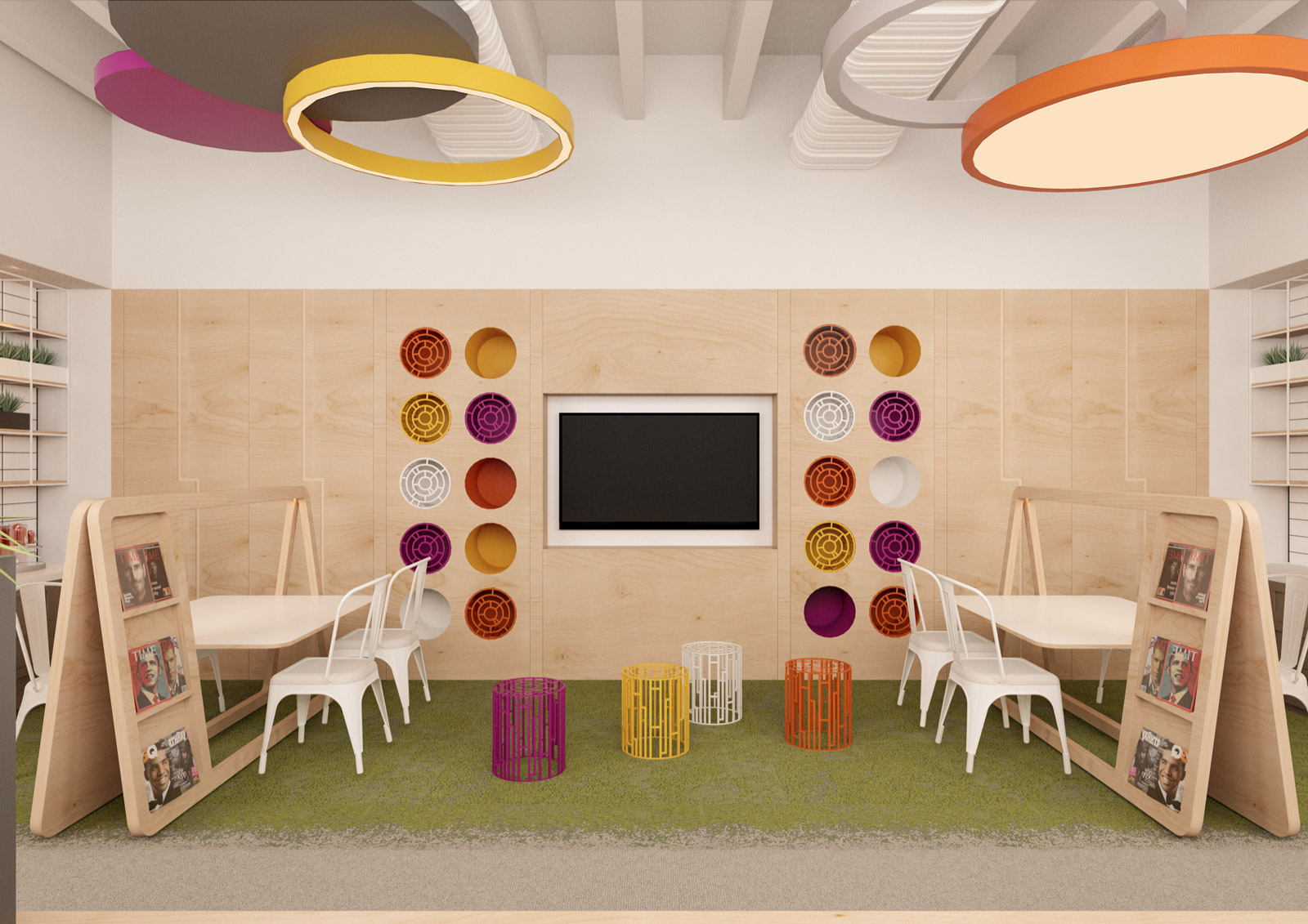 Çalışanların öğle ve mesai aralarında kullandıkları lounge alanında ise, çalışma alanından farklı olarak canlı renkler ve eğlenceli detaylar kullanılarak çalışanların kısa bir süreliğine de olsa ofis ortamından uzaklaşmış hissetmeleri sağlandı. Mutfak alanıyla iç içe planlanan lounge alanında çalışanlara uzanma, kitap okuma, konsol oyun oynama, ses izolasyonu sağlanmış kabinlerde telefon görüşmesi yapma gibi imkânlar hazırlandı.