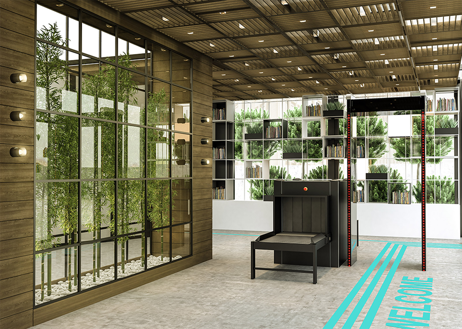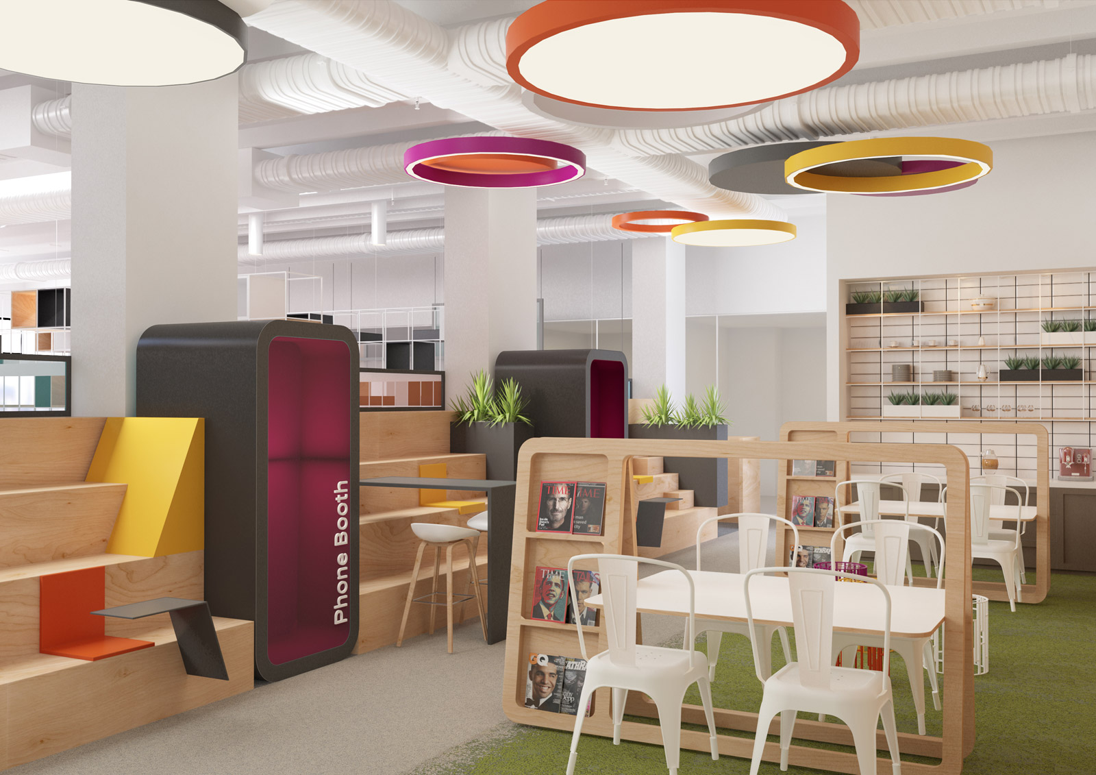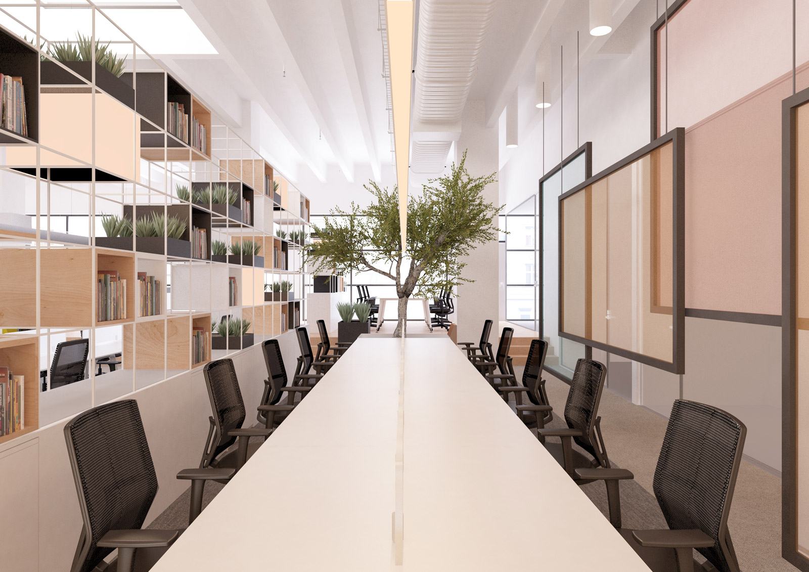 Aynı mekânda çok sayıda kişinin bir arada çalışmasının sonucu olarak doğan kaosu minimum seviyede tutmak adına yarı geçirgen tasarlanan kütüphaneler, çalışma istasyonlarının aralarına yerleştirildi ve ihtiyaç duyulan izolasyon ve mahremiyet görsel bağlantıyı tamamen koparmadan sağlanmış oldu.