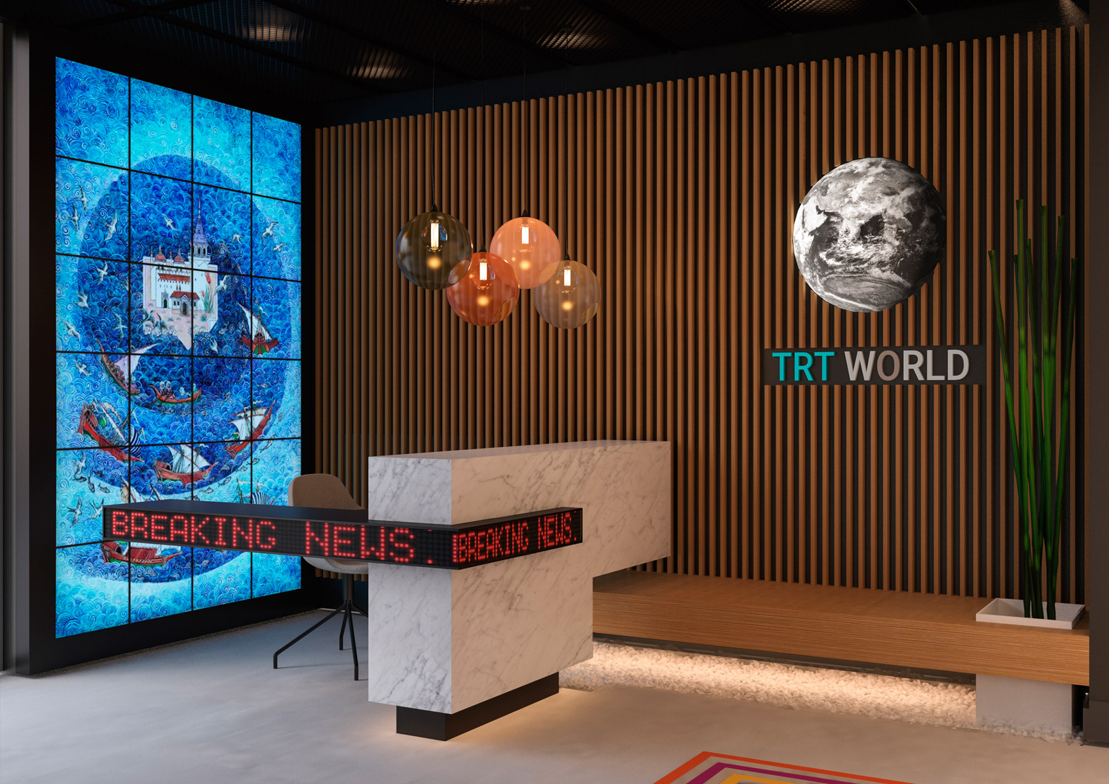 Ofisin ana girişinde, TRT World’ün tüm dünyaya yayın yapan bir televizyon kanalı olduğunu vurgulamak amacıyla daha farklı bir tasarım dili kullanılırken, dijital ekranlarda kendi kültürümüzden bir değer olarak “minyatür” sanatına yer verildi.