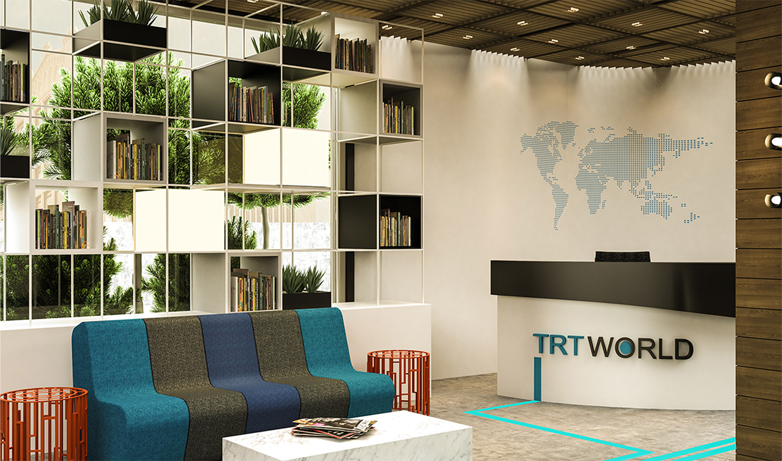 TRT World’ün Londra’da, Leicester Square’de bulunan ofisi, şirketin çok uluslu çalışan profili gözetilerek, açık renklerin, doğal malzemelerin ve gerçek bitkilerin baskın olduğu, olabildiğince modern, sade ve evrensel bir yaklaşımla tasarlandı. Çalışma alanlarında konsantrasyonu maksimum seviyede tutabilmek için algıyı dağıtacak öğelerden özellikle kaçınıldı ve iç açan, ferah bir çalışma ortamı yaratıldı.