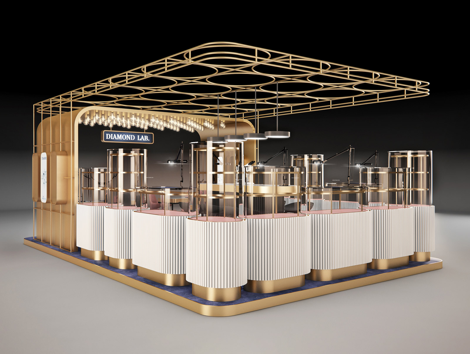 Özel tasarım mücevher satan Diamond Lab markası için çeşitli alışveriş merkezleri, havalimanları içerisinde yer alacak, gerektiğinde büyüyüp küçülebilecek, modüler bir düzende planlanan butik mağazalara, eğrisel formlarla feminen bir hava katılırken, bu standların malzeme, renk ve doku seçimleriyle “albenili” ve “fark yaratan” bir tasarıma sahip olmalarını sağlandı.