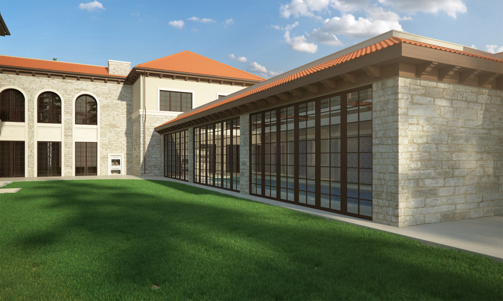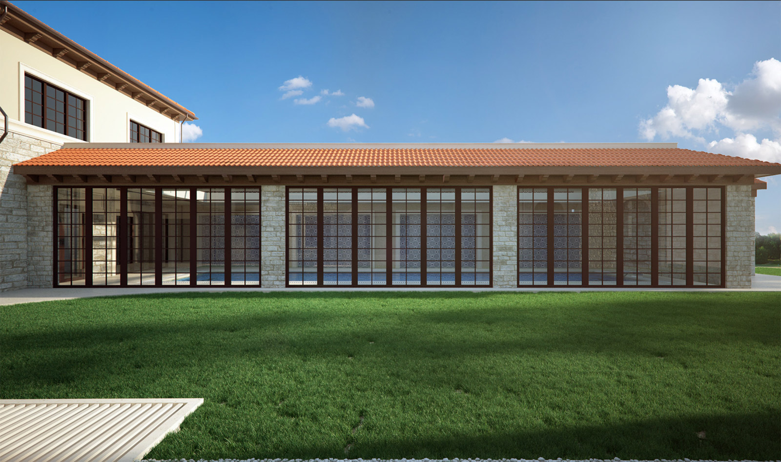 Cephe malzemesi olarak İtalya’dan getirilen özel bir taş kullanılırken, çatı kiremitleri Portekiz’in ünlü köylerinde özel olarak üretildi. İç avluda Toscana esintisi sağlamak amacıyla, bahçeye önemli derecede etki eden kapanır açılır havuzun arka duvarındaki çiniler İtalya’da el boyaması yöntemiyle üretildi.