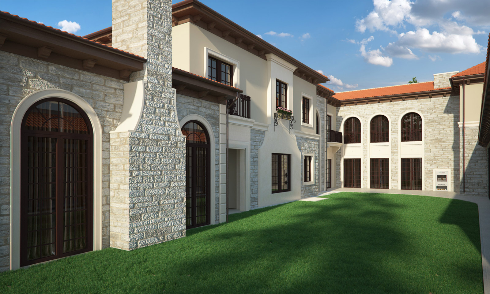 Garaj girişinin de bulunduğu ön cephede, daha sağır yüzeyler tercih edilerek, yaşamın şeffaf cam yüzeylerle avluya yönlenmesi sağlanırken, garaj üstünde konumlandırılan müştemilat, avlunun mahremiyetini korumak amacıyla sokağa doğru cephelendirildi.